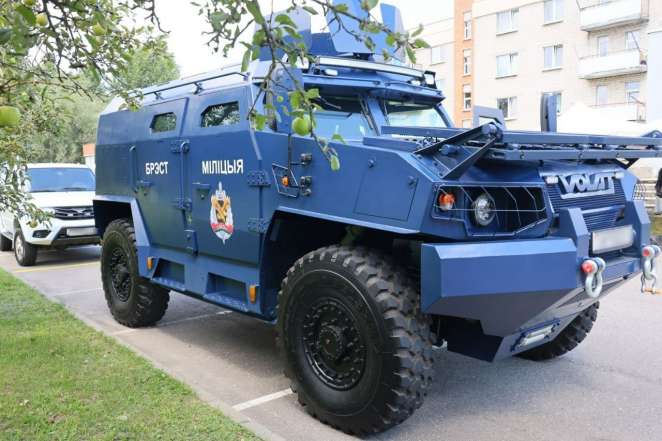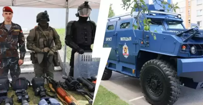 Министру показали технику, вооружение и спецсредства ОМОН УВД Брестчины. Как видно на фото, это в том числе противотанковая управляемая ракета (ПТУР), гранатомет, бинокль, пульт управления беспилотниками и не только.