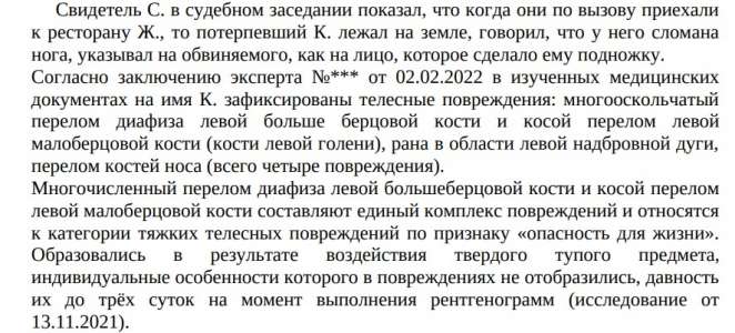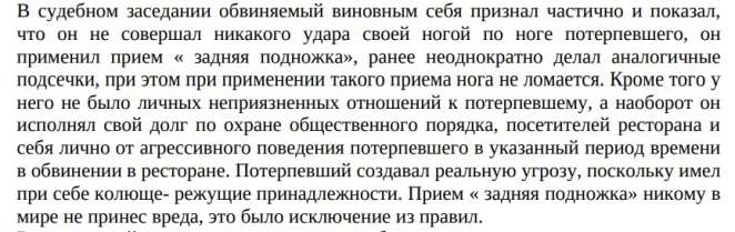 Наконец, на записи с видеокамер было видно, что Валерий не сделал подсечку, а именно нанес удар по ноге. Эксперт в суде дополнительно пояснил, что для такого сложного перелома при ударе надо, чтобы нога была твердо зафиксирована на земле и не могла отскочить — это и обеспечил администратор, прижимая Руслана за плечи.