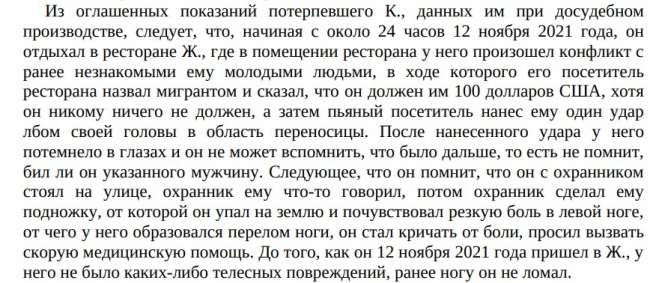 Руслан же говорил, что Николай с друзьями назвал его «мигрантом» и потребовал с него за что-то вернуть 100 долларов, хотя они даже не были знакомы, а затем ударил лбом в лицо. После этого, по словам Руслана, у него потемнело в глазах и он не помнит, бил ли дальше незнакомца.
