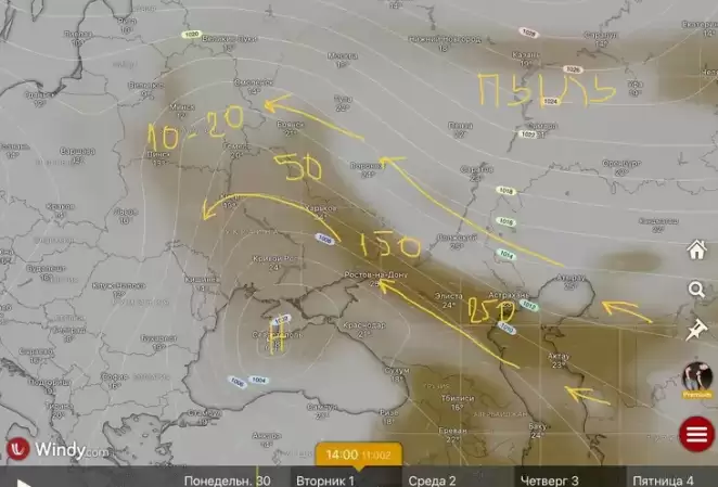 По мнению автора канала, центральноазиатская пыль долетит до нас завтра утром, так как потоки в атмосфере для этого благоприятные. Правда, концентрации ее будут довольно низкие.