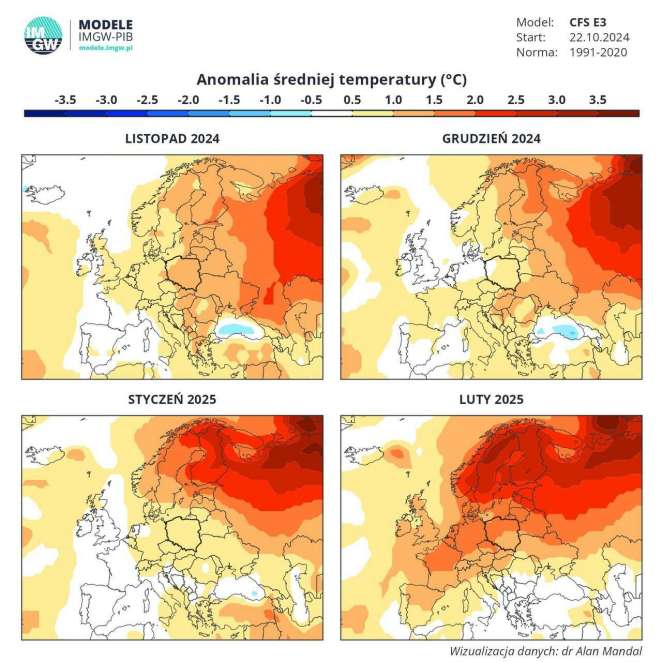 Обновленный численный прогноз температурных аномалий от CFS E3 на следующие 4 месяца опубликовали авторы тематического Telegram-канала о погоде Nadvorie. Исходя из этих данных, в следующем месяце в Беларуси будет по-прежнему держаться аномально теплая для этого сезона погода: ожидается, что температура в среднем будет на 1-1,5 градуса выше климатической нормы. Следовательно, средняя температура в ноябре составит +2,6.. +3,1°С.