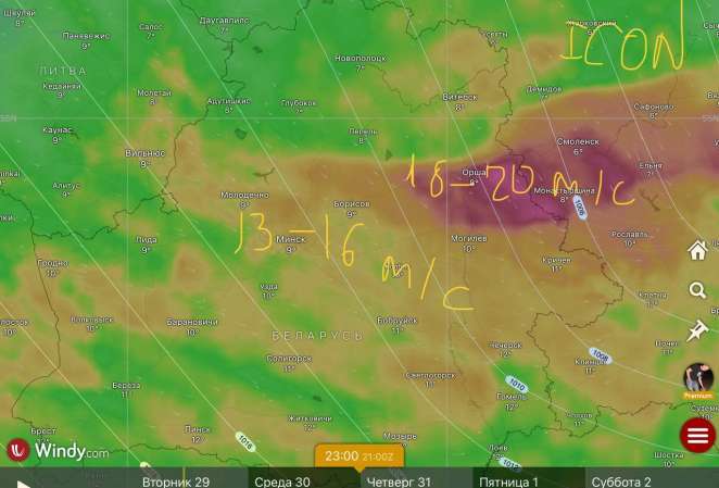 «Минск, скорее всего он пройдёт часов в 17–18. Ливни, местами с крупой. Усиление и смена направления ветра на северо-западный, порывы до 16–18 м/с. Свежий ветер будет дуть всю первую половину ночи усиливаясь на севере и востоке страны до 20 м/с [72 км/ч]», — отметили в тг-канале.