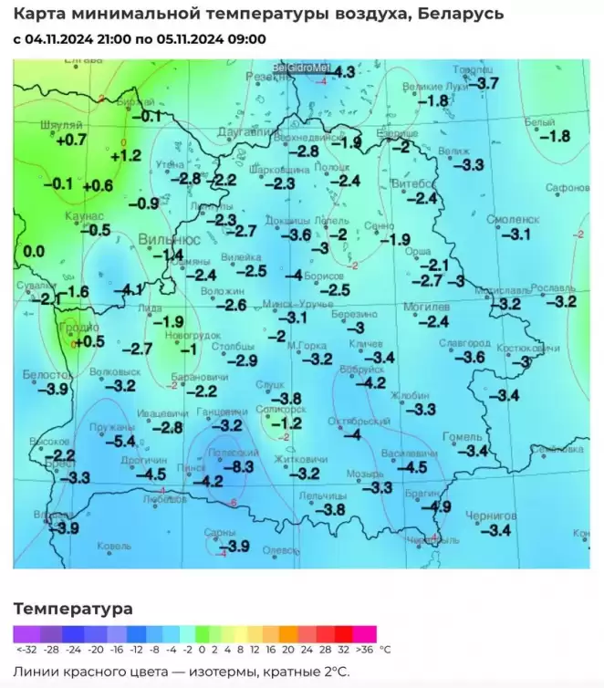 В Брагине — -4,9°C, в Минске — минус 3°C. Плюс был только в Гродно +0,5°C.