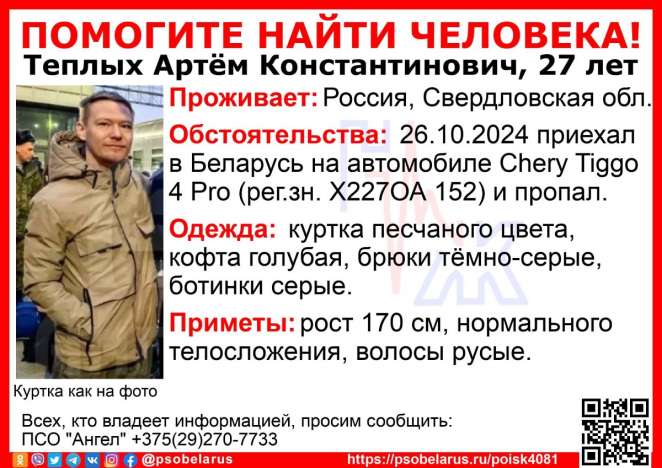 Пропавшего зовут Артем Теплых, ему 27 лет, жил в Свердловской области России. 26 октября 2024 года мужчина приехал в Беларусь на автомобиле Chery Tiggo 4 Pro (регистрационный номер Х227ОА 152) и пропал.
