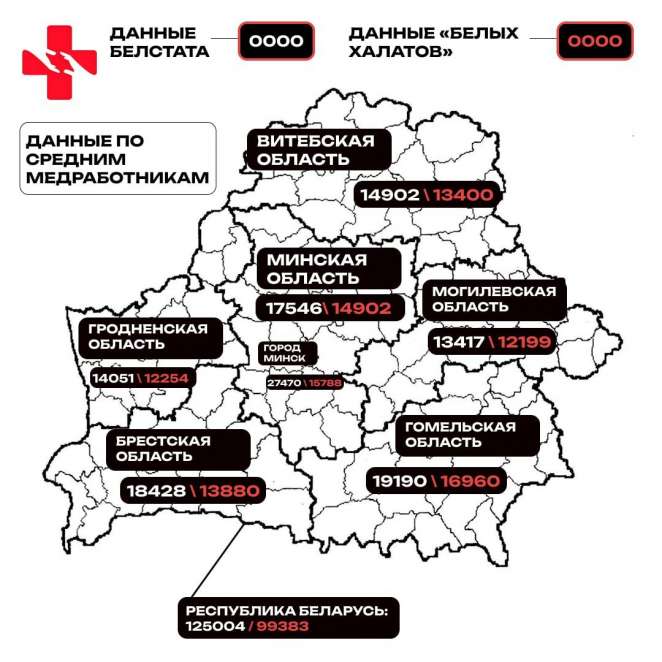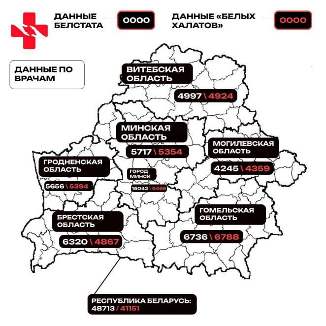 «Таким образом, при поверхностном анализе у нас есть все основания полагать, что Белстат в своем отчете завысил укомплектованность медицинскими кадрами не менее чем на 7562 врача-специалиста и не менее чем на 25 621 среднего медицинского работника. То есть примерно на 20%», — утверждает инициатива.