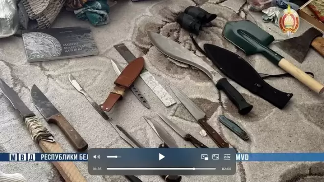 В милицейском ролике также показали кадры с обыска из дома могилевчанина. Были видны разные ножи, часть из которых кухонные, а также книги — одна про монеты, другая про взрывчатые вещества. Кроме того, упоминалось, что у мужчины были книги по психологии и «экстремистская литература» — возможно, речь о предвыборном плакате Светланы Тихановской.