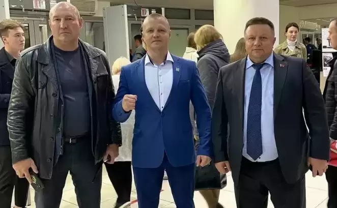 Сергей Заславский (в центре) с бывшим командиром минского ОМОНа Дмитрием Балабой (слева) и депутатом, бывшим заместителем министра внутренних дел Александром Барсуковым