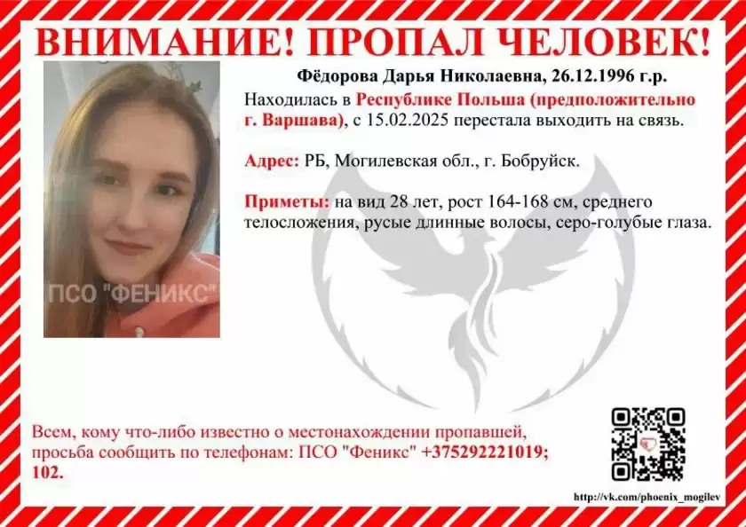 28-летняя Дарья Федорова перестала выходить на связь с родными с 15 февраля. Теперь девушку ищут, сообщает «Могилев. Онлайн» со ссылкой на поисково-спасательный отряд «Феникс».