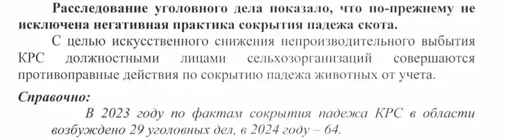 Расследование уголовного дела показало, что распространяется практика сокрытия падежа скота руководителями. Так, за 2023 год по этому факту было возбуждено 29 уголовных дел, в 2024 году — уже 64.