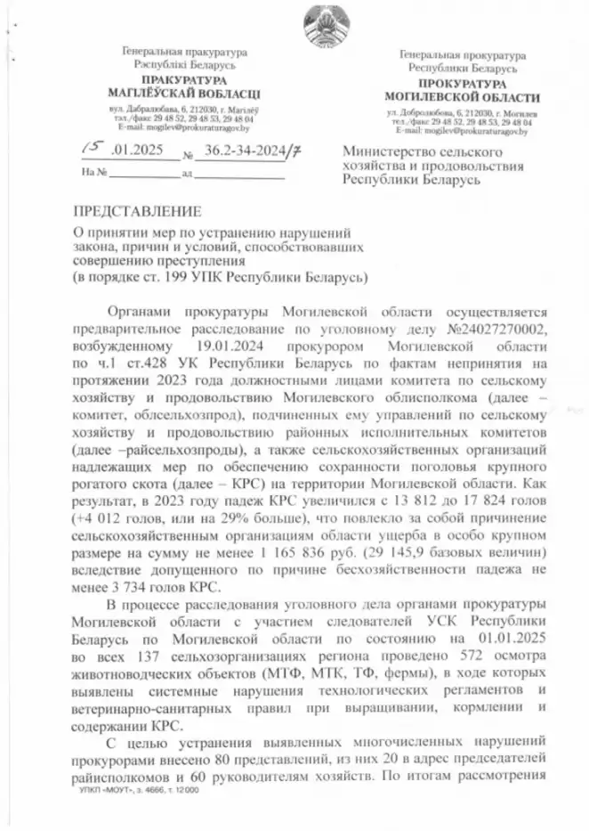 Прокуратура также выявила факты гибели скота из-за безответственности. Так, из-за халатности директора и главного ветеринара ОАО «Жорновка АГРО» Осиповичского района погибло 158 голов скота. Ущерб составил более тысячи базовых величин. Против виновных возбуждено уголовное дело.