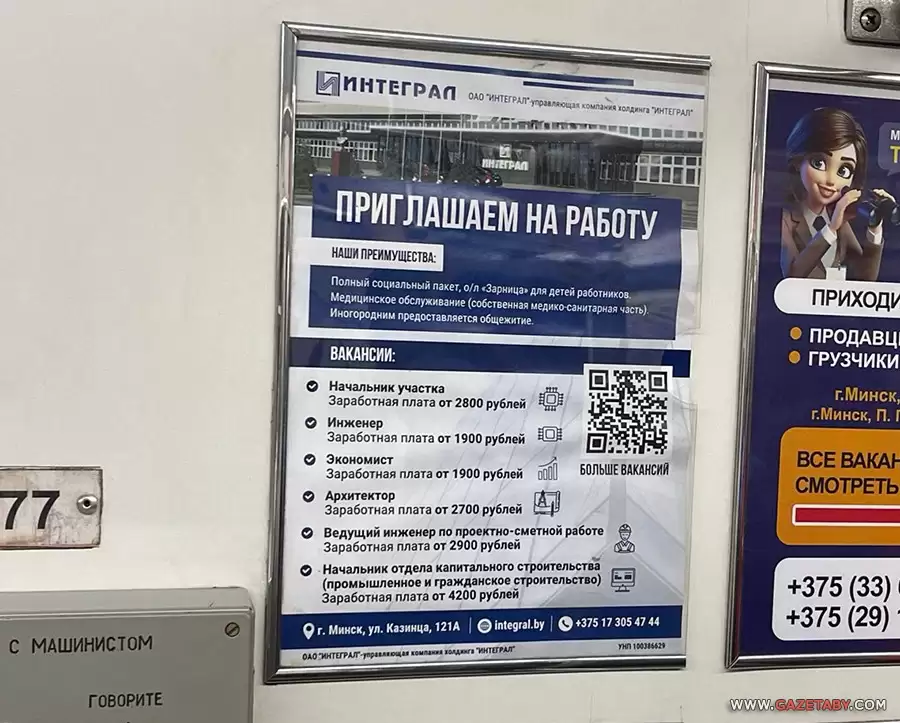 В объявлении, размещенном в поезде минского метро, указано, что ОАО «Интеграл» нужны инженеры, экономисты, архитектор, начальник участка, начальник отдела капитального строительства.