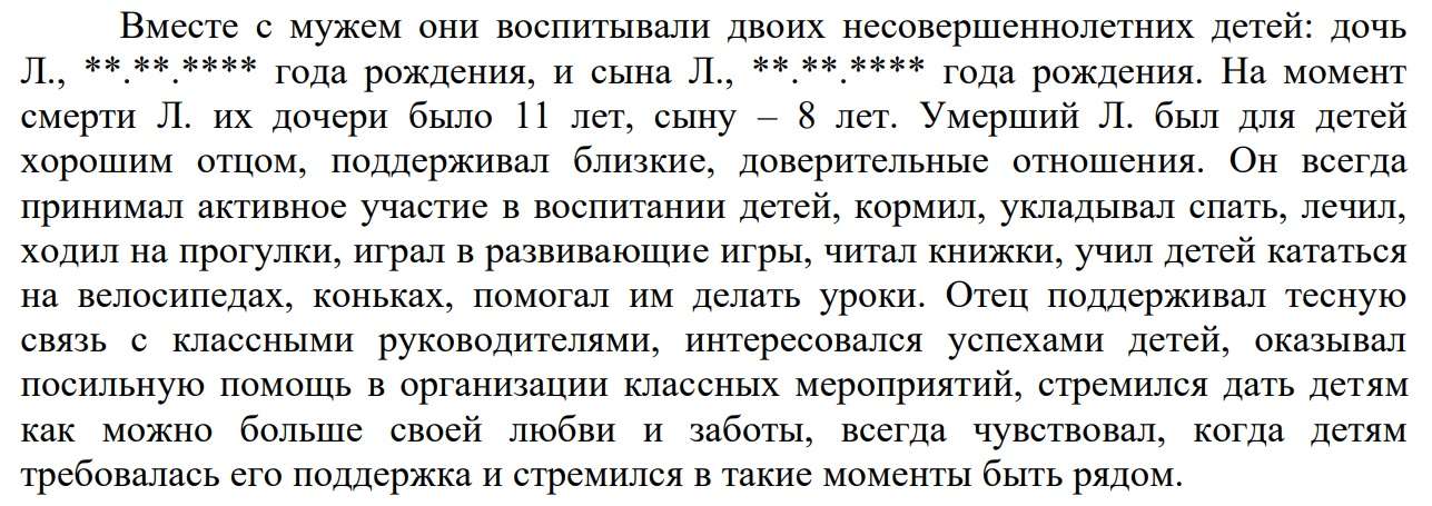 «После его смерти у сына отмечались ярко выраженные черты тревожности и подавленности, он стал менее активным, закрытым в себе, часто приходил в школу без настроения и не хотел заниматься на уроках, плакал и капризничал, аргументировал свое поведение тем, что вспоминает и грустит по отцу. После смерти отца дочь также стала более замкнутой, с трудом шла на контакт, до сих пор любые упоминания о смерти отца для нее болезненны», — говорится в материалах дела.