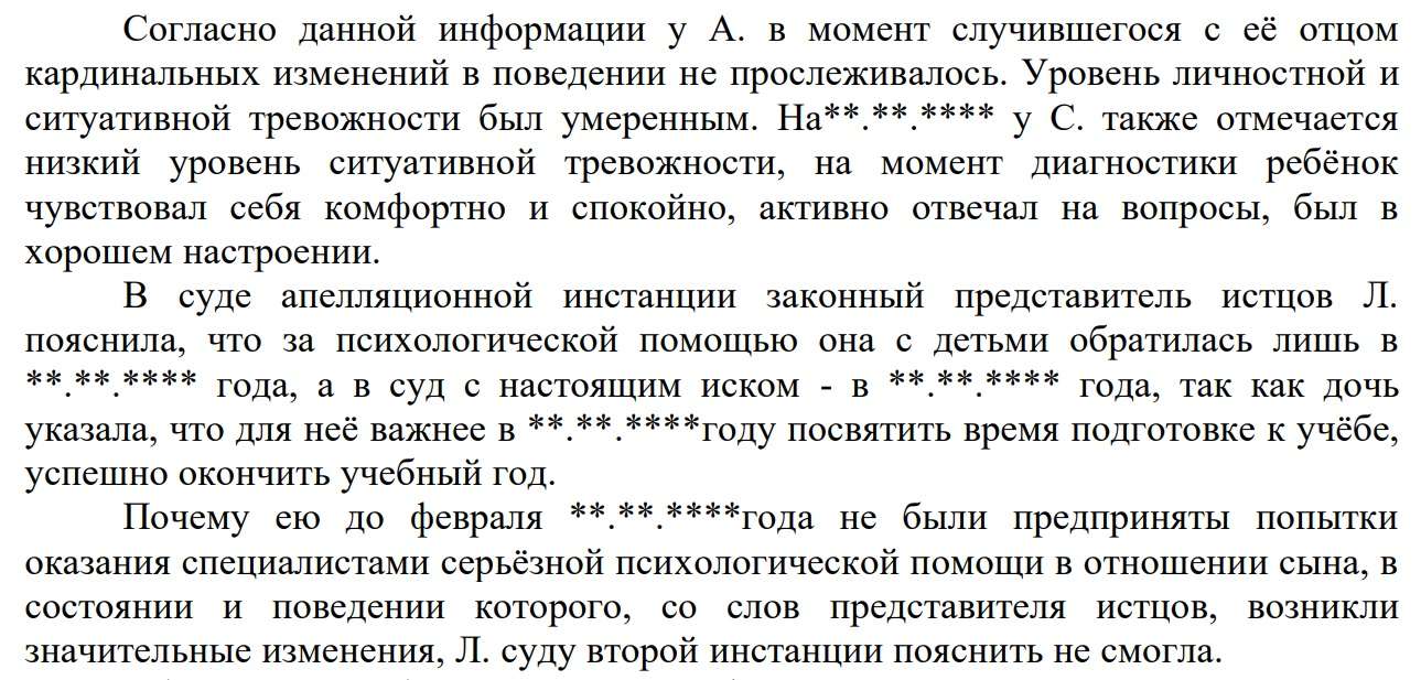 В суде также отметили, что мать не обращалась за психологической помощью сразу после трагедии — первый визит к специалисту состоялся более чем через год. Обследование, проведенное в школе, не выявило у детей тяжелых эмоциональных нарушений — уровень тревожности у сына и дочери был умеренным. В иске не были представлены доказательства ухудшения здоровья детей, кроме стандартных заболеваний (фарингиты, тонзиллиты и различные ОРВИ).