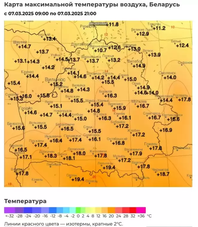 В Дрогичине было +18,3°С, в Пинске +18,1°С, в Минске +15,4°С. В Верхнедвинске +10,7°С.