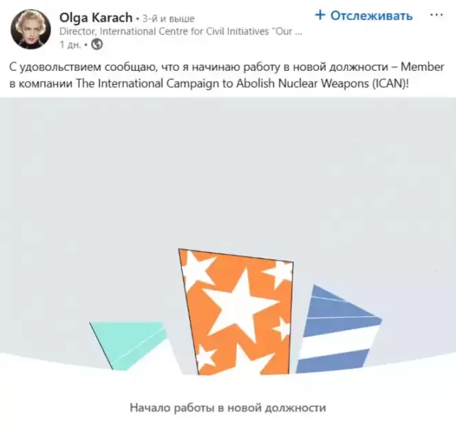Пост о своей новой работе в роли «члена организации» Ольга Карач опубликовала в LinkedIn.