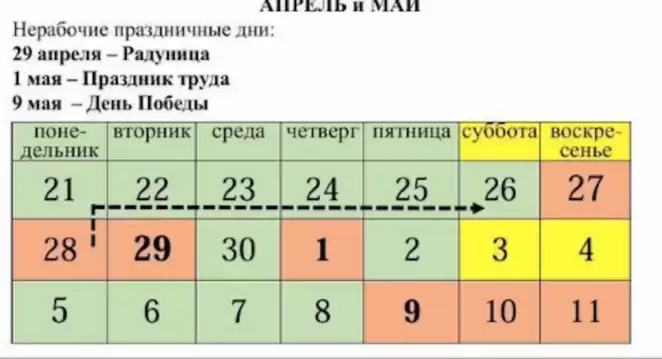 Но затем 30 апреля (среда) — рабочий день, а 1 мая (четверг) снова выходной. 2 мая — рабочий, а 3 и 4 мая — обычные суббота и воскресенье.