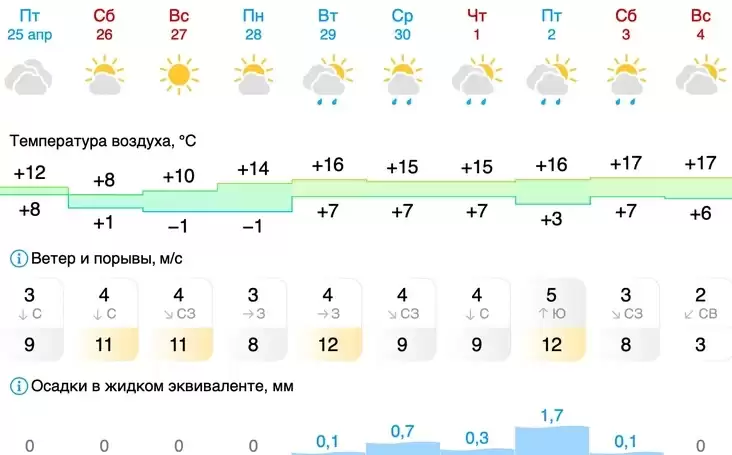 Ветер северный, северо-западный умеренный, днем местами порывистый, на востоке сильный порывистый. Ночью на большей части территории республики ожидаются заморозки 0..-5°С, местами минимальная температура воздуха составит +1..+2°С; максимальная днем +7..+14°С.
