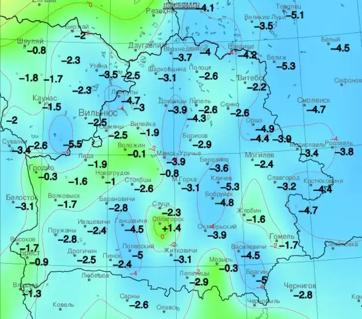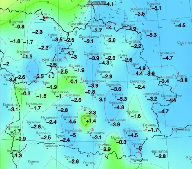 В Орше было минус 4,9°С, в Василевичах на Гомельщине — минус 4,5°С, на севере Беларуси — минус 4°С. В Минске — минус 3,9.