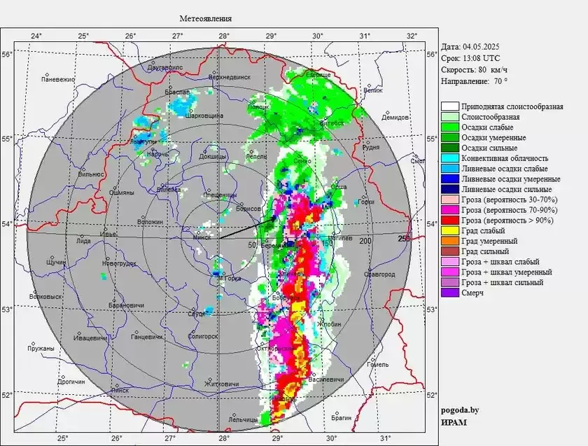 По Беларуси сформировалось несколько мощных суперъячеек — это разновидность грозового облака с восходящим воздушным потоком среднего масштаба, который вращается. Такие суперъячейки могут принести не только ливни и град с сильным ветром, но и смерчи.