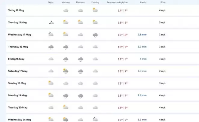 В среду, 14 мая, утром и днём на большей части территории пройдут кратковременные дожди, в отдельных районах на западе Беларуси — сильные дожди и грозы. Ночью и утром местами слабый туман. Ветер западной четверти умеренный, днём местами порывистый, при грозах сильный порывистый. Ночью +1..+6°С, на почве местами заморозки 0..-2°С, днём +11..+18°С.