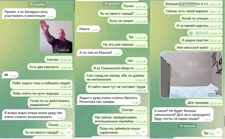По другим сообщениям видно, как у нового сторонника спрашивают, готов ли он «действовать радикально». Тот отвечает, что «вчера ходил на акцию возле РОВД, там сложно акционировать».