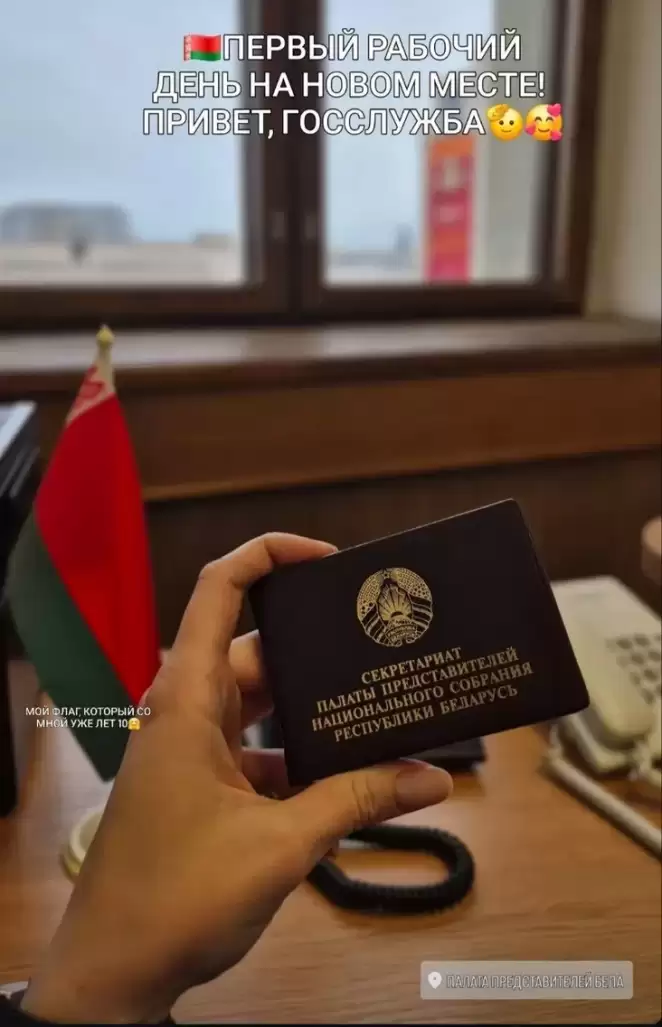 «Первый рабочий день на новом месте! Привет, госслужба», — подписала Светлана снимок, на котором держит удостоверение сотрудницы секретариата Палаты представителей.