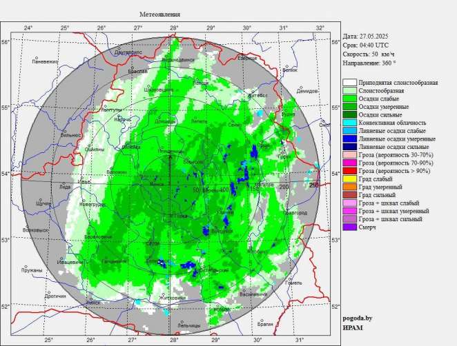 «Доброе утро. Сегодня очередной день мокрого сурка на большей части территорий, в том числе и в Минске», — так начали своё утреннее сообщение 27 мая в Telegram-канале о погоде в Беларуси «Метеовайб». По их данным, лишь на самом западе страны под влиянием гребня Азорского антициклона, а на востоке Могилёвской и Гомельской областей (под влиянием антициклона над европейской частью России) дождей не ожидается.
