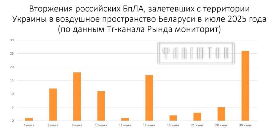 Это показало изучение данных украинских мониторинговых каналов. По подсчетам Флагштока, с вечера 30 июля зафиксировано минимум 26 случаев залетов (согласно данным Тг-канала «Рында мониторит») в воздушное пространство Беларуси российских БПЛА при атаке территории Украины.