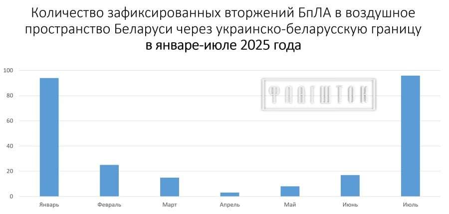 С учетом всех залетевших в июле в Беларусь российских БпЛА побит месячный рекорд января 2025 года — минимум 96 случаев нарушения воздушного пространства Беларуси через Гомельскую, а также Брестскую области.