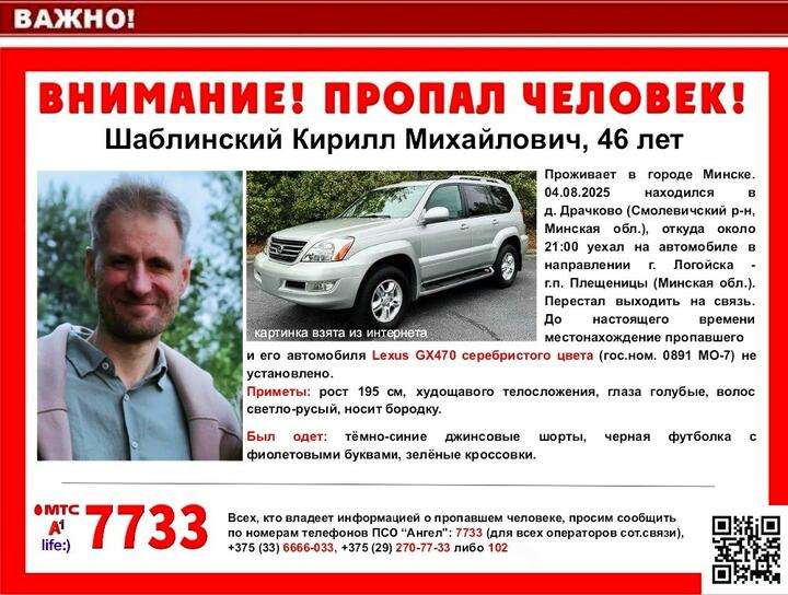 Минчанин Кирилл Шаблинский после визита к матери пропал в Логойском районе вместе с машиной. Он перестал выходить на связь вечером 4 августа, и с тех пор о его местонахождении ничего не известно. Последний раз его Lexus зафиксировали камеры в Плещеницах, пишет Kraj.by.