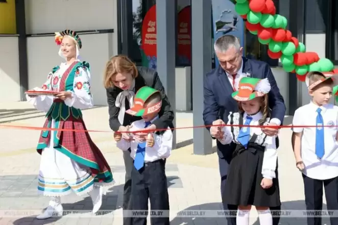 Петкевич и Крупко для красивой картинки перерезают ленточку вместе с детьми. Фото: БелТА