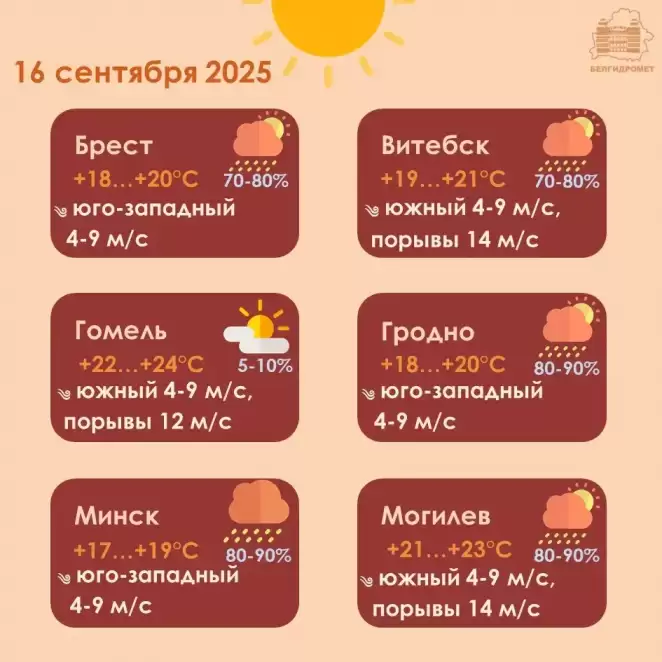 Термометры ночью покажут 8-14 градусов тепла. Днем воздух прогреется до +16...+21 градуса, по востоку Беларуси ожидается до 24 градусов выше нуля.