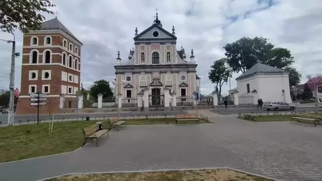 Раньше на углу улиц Гейсика и Адама Мицкевича был сквер с деревьями, которые красиво обрамляли великолепную барочную архитектуру костела, но теперь все изменилось.