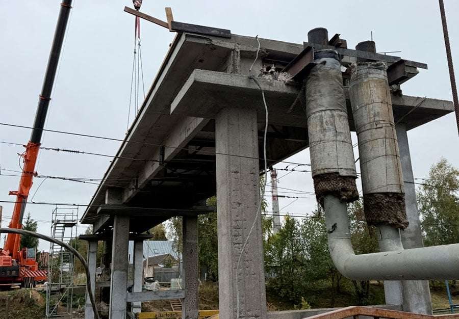 Теплотрасса закреплена на конструкциях пешеходного моста через железную дорогу. Сейчас одновременно проходят его реконструкция и переврезка системы теплоснабжения.