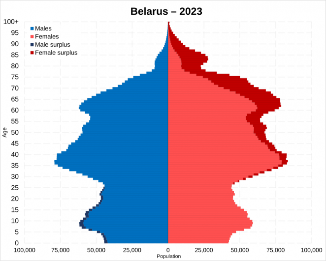 Половозрастная структура населения Беларуси в 2023 году. Изображение: Tweedle с сайта wikipedia.org, данные с портала UN World Population Prospects