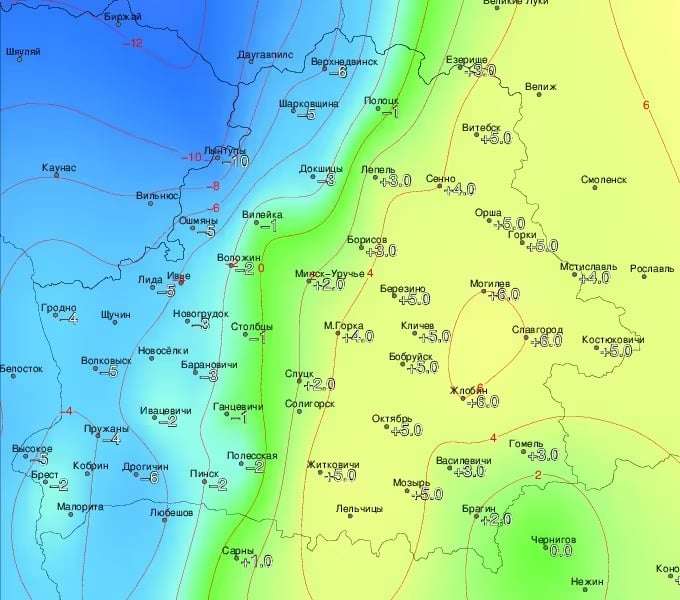 Резкому похолоданию в Беларуси после выходных способствовал уход очередного циклона - утром в понедельник его тёплые фронты ещё сохранили своё влияние в центре и на востоке страны, в результате чего территория Республики оказалась поделена пополам: тёплый восток и морозный запад. Согласно оперативным данным Белгидромета, в 9:00 20 октября в Славгороде Могилёвской области и Жлобине Гомельской области было +6°С, тогда как в Брестчине, Гродненщине и Витебщине столбики термометров ушли в минус.