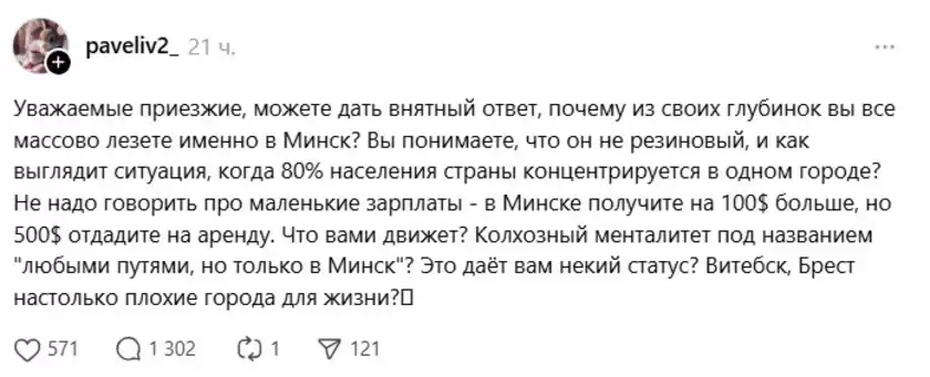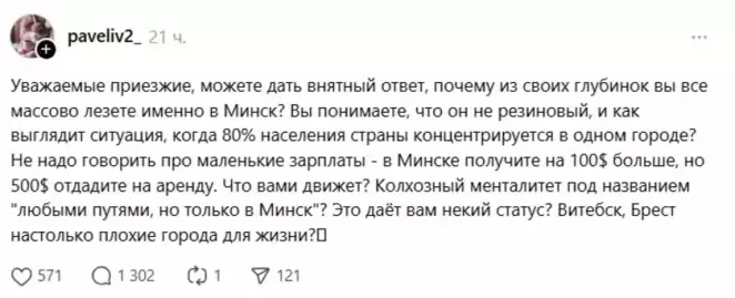 Однако многие комментаторы не разделяют ее возмущения. Большинство напомнило об экономических причинах переезда: в Минске более высокие зарплаты и больше возможностей для карьеры. Некоторые даже с иронией отмечали, что в небольших городах невелико и количество вакансий.