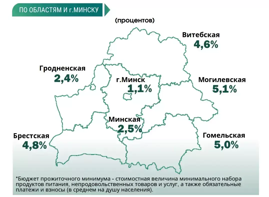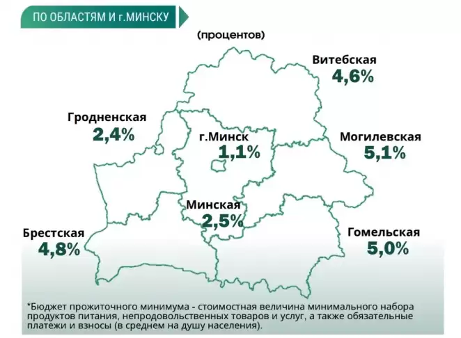 Наименьший процент малообеспеченных граждан зарегистрирован в Минске (1,1 %), а наибольший — в Могилёвской области (5,1 %).
