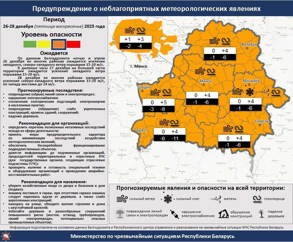 Оранжевый уровень опасности объявлен в Беларуси с 26 по 28 декабря