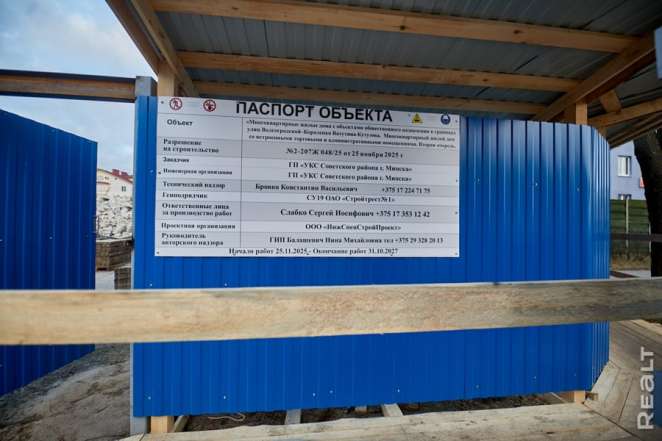 Стройка уже огорожена забором, так и что паспорт объекта в наличии. Там написано, что стройка многоквартирного дома началась 25 ноября этого года, а завершить ее намерены в IV квартале 2027-го года.