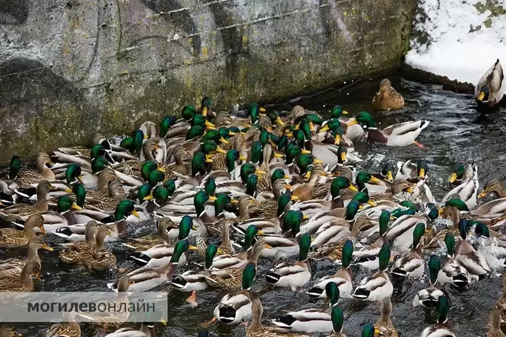 На кадрах очевидцев видно, как сотни птиц плотно устроились на небольшом участке воды, который еще не замерз. Могилевчане, прогуливаясь рядом, охотно подкармливают эту большую стаю.