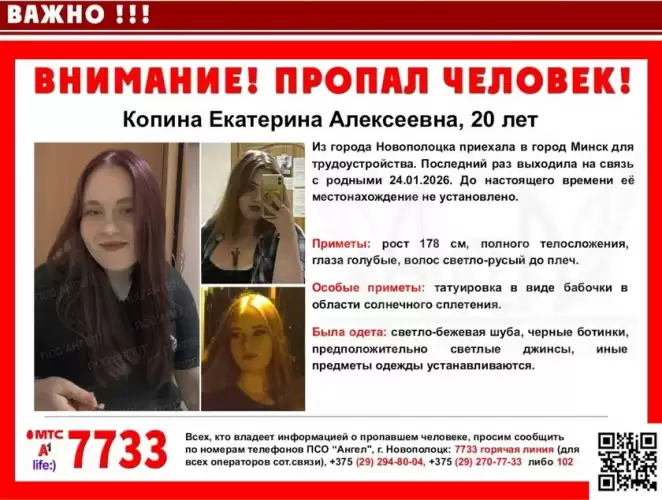 В Минске ищут 20‑летнюю Екатерину Копину. Девушка приехала из Новополоцка на работу и пропала. Последний раз выходила на связь 24 января 2026 года.