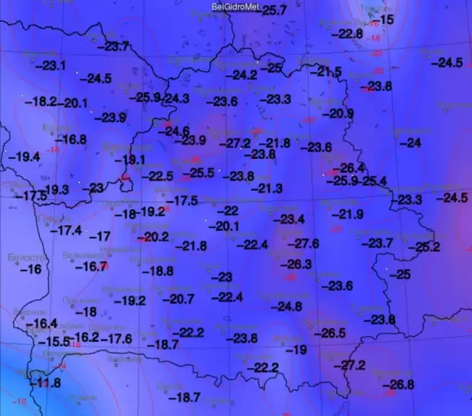В районе Кличева — Бобруйска было минус 27,6°C, в районе Докшицы — 27,2°C.