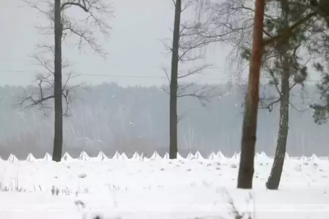 Представленные снимки укрытия для бронетехники, кубы для создания укреплений, асфальтовое шоссе, полоса противотанковых бетонных пирамид на фоне смешанного леса и электрических проводов — все это есть в учебном укрпленном районе около деревни Калинино в Гомельском районе. О существовании других подобных укреплений в регионе информации нет.