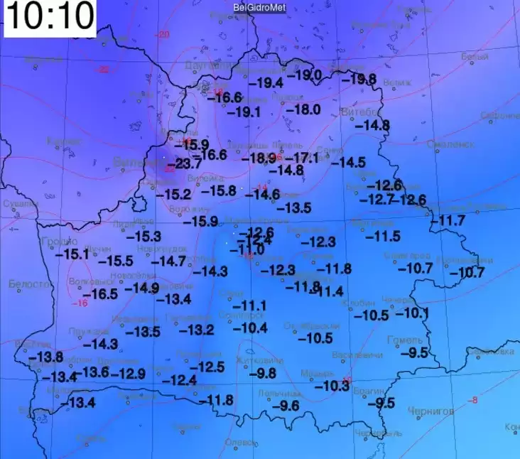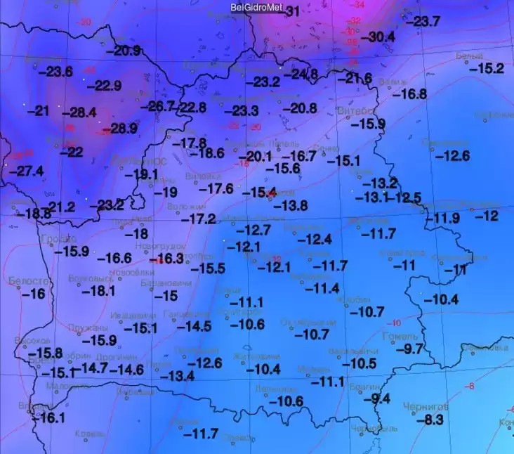 В Полоцке было минус 24,8°С, в Шарковщине — минус 23,3°С, на Миорщине — минус 22,8°С, в Минске — минус 12,7°С.