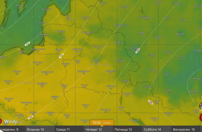 Так, по данным европейской модели прогнозирования ECMWF, к четвергу, 12 марта , по западу Беларуси воздух прогреется до +15..+18°С . А вот на востоке к этому времени, судя по всему, еще не растает весь снег и в целом будет примерно на 10 градусов холоднее.