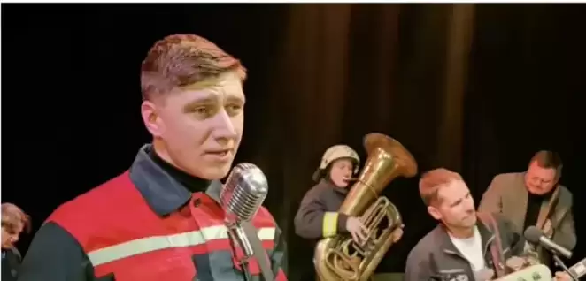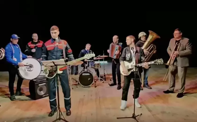 На кадрах мужчины играют на музыкальных инструментах и поют шутливую песню-поздравление: