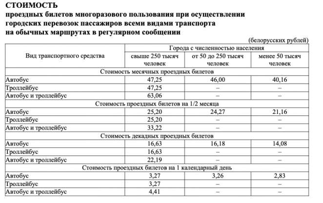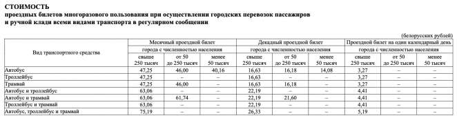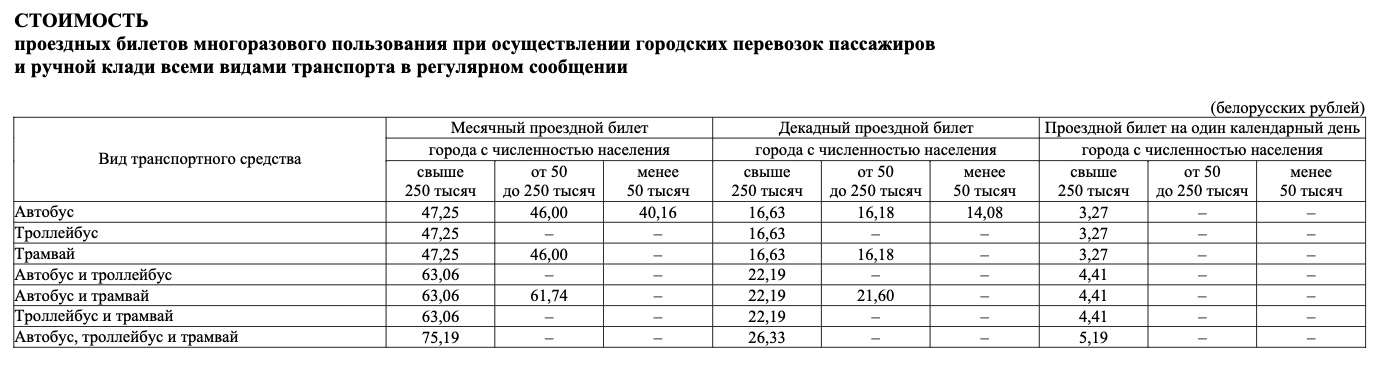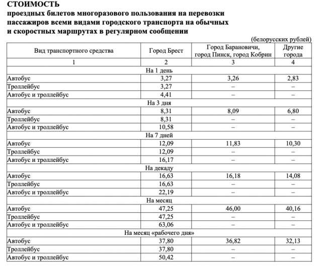 Тарифы на проездные. Март 2026 года. Скриншот: pravo.by