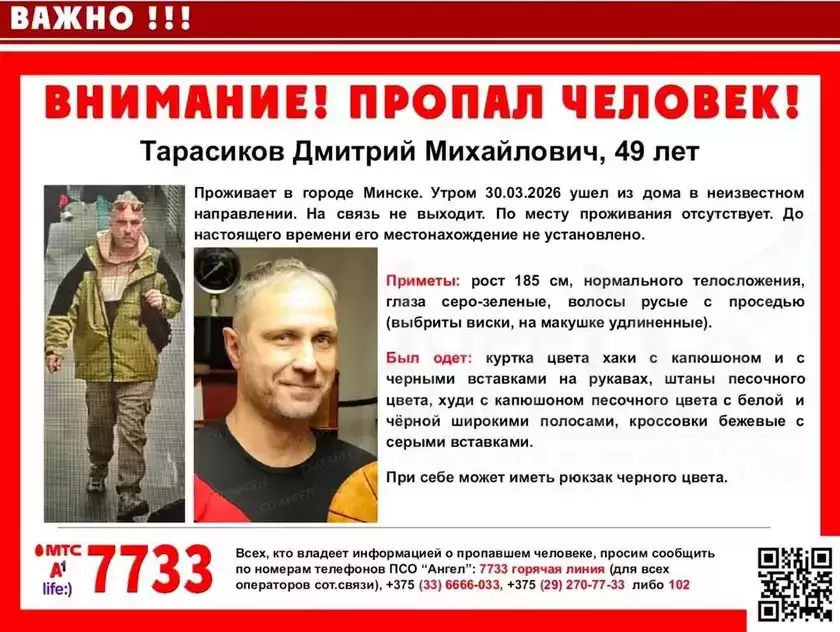 Информацию о поисках 49‑летнего Дмитрия Тарасикова опубликовали в соцсетях поисково-спасательного отряда «Ангел». В ориентировке сказано, что мужчина ушёл из дома утром 30 марта. С того момента минчанин не выходит на связь, его местонахождение не установлено, пишет «Онлайнер».