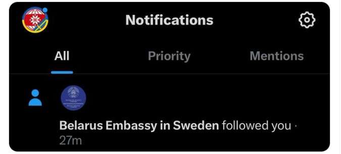 Аккаунт беларусского посольства в Швеции подписался в соцсети X на аккаунт Народной амбасады Беларуси в Швеции. Скриншот в подтверждение этого появился в аккаунте этой организации.